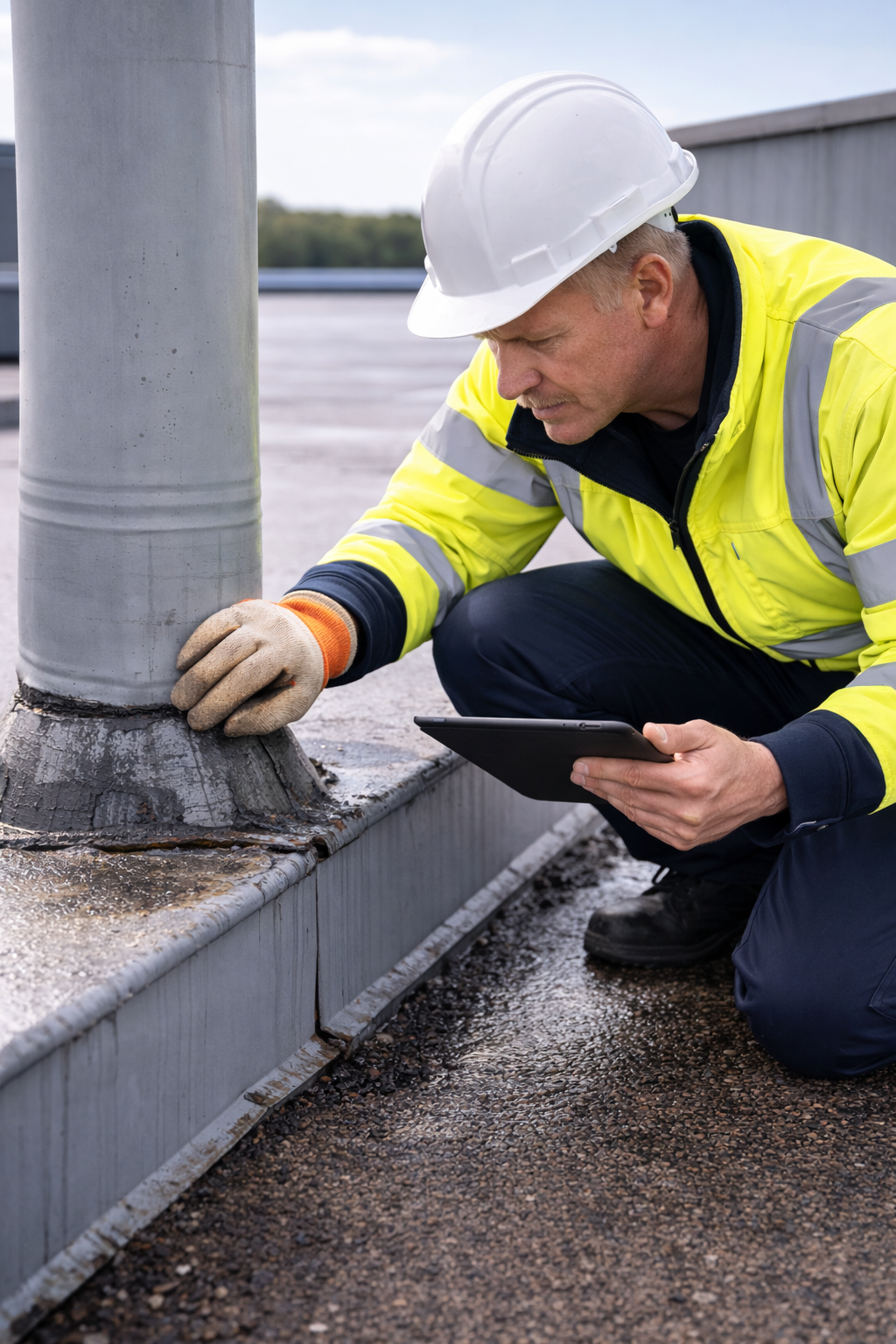 Überprüfung aller kritischen Punkte wie Anschlüsse, Übergänge und Entwässerungssysteme.